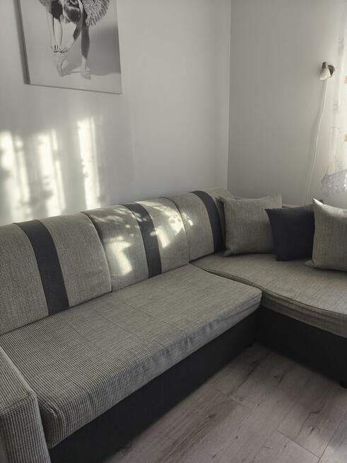Używana narożna sofa w szarym kolorze z czarnymi akcentami. Mebel w dobrym stanie, idealny do uzupełnienia aranżacji ...